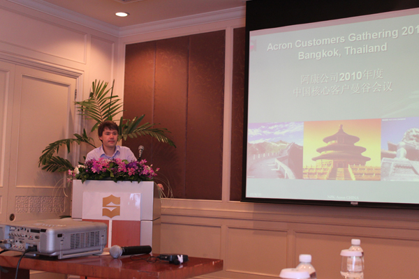 ??? 11月4日至6日,中農控股股份有限公司磷復肥部經理王秦燕一行參加了俄羅斯阿康股份有限公司在泰國曼谷召開的“核心客戶市場研討會”。??? 本次會議是在國際化肥市場行情持續上漲的背景下召開的。會議期間,阿康公司對全球市場過去一年的工作情況進行了總結,并對明年國際化肥市場的發展趨勢進行了展望。阿康公司的主要客戶代表參加了此次研討會,會議取得圓滿成功。??? 在我公司與阿康公司洽談中,王秦燕經理表達了公司期望與阿康公司加強多方面合作的愿望,阿康公司也表示加強業務合作有利于雙方的長遠利益。雙方就加強重點合作業務方面交換了意見。??? 阿康公司是俄羅斯最大的化肥生產企業,去年的化肥總產量達到450萬噸。無論是在俄羅斯農化市場,還是在世界農化市場,阿康公司都占有較高的市場地位并享有良好的信譽。??? 圖為阿康公司2010年度中國核心客戶會議報告現場: